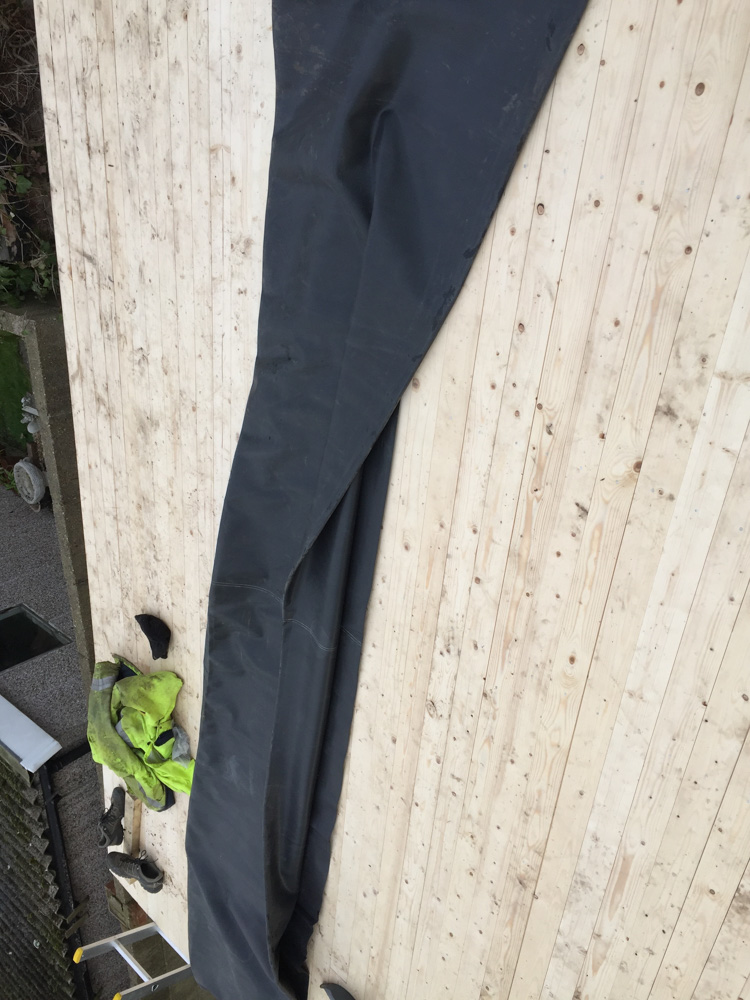 Because its a flat roof, and because mineral felt is shite, I opted for the EDPM option. Basically its thick synthetic rubber that’s supposed to last for 25 years. What I hadn’t appreciated is that thick rubber weighs a lot. 55KG lot. Hauling two thirds of your weight up a ladder is surprisingly difficult. The only practical option was to unroll the 1 meter roll, turn it into single roll the width of the roof and shove it over one should and climb.