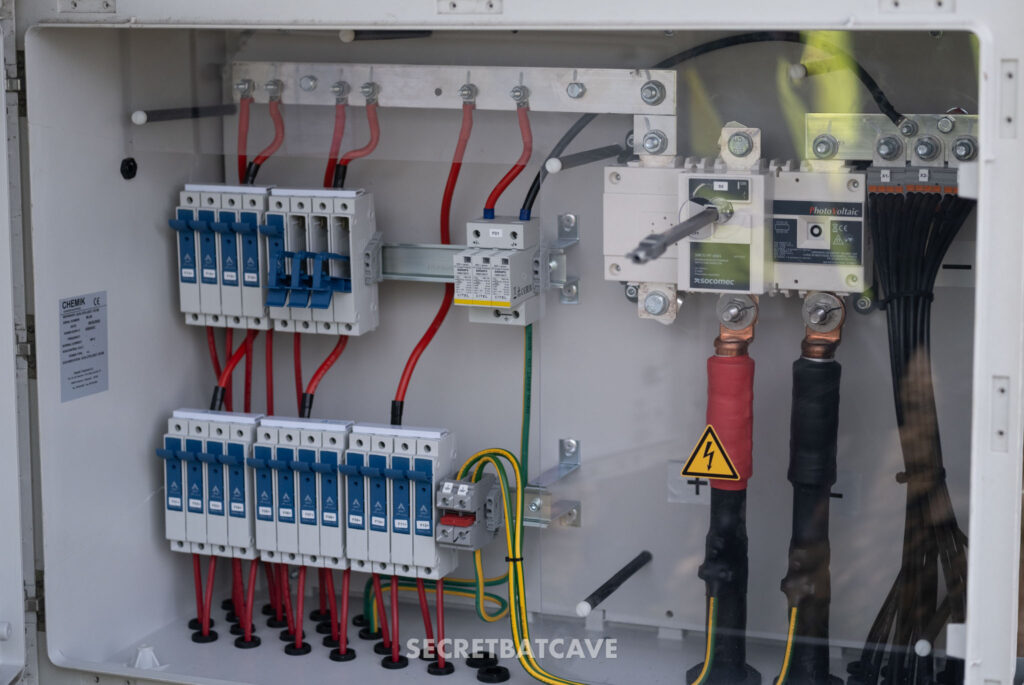 The “cables” (scaffolding poles) are raised up to the first set of switches. This lifts the cable over the fence (we’ll get back to that later) to the compound that contains our equipment.We also have a set of switches. After the switches are the meters. This allows us to work out how much power we are pushing into the grid.
