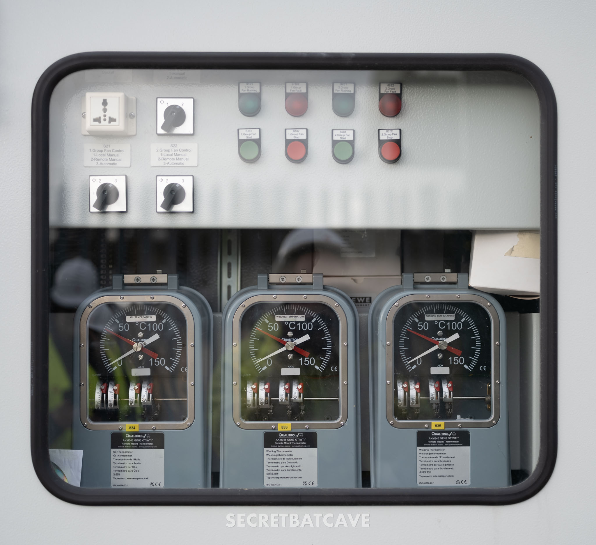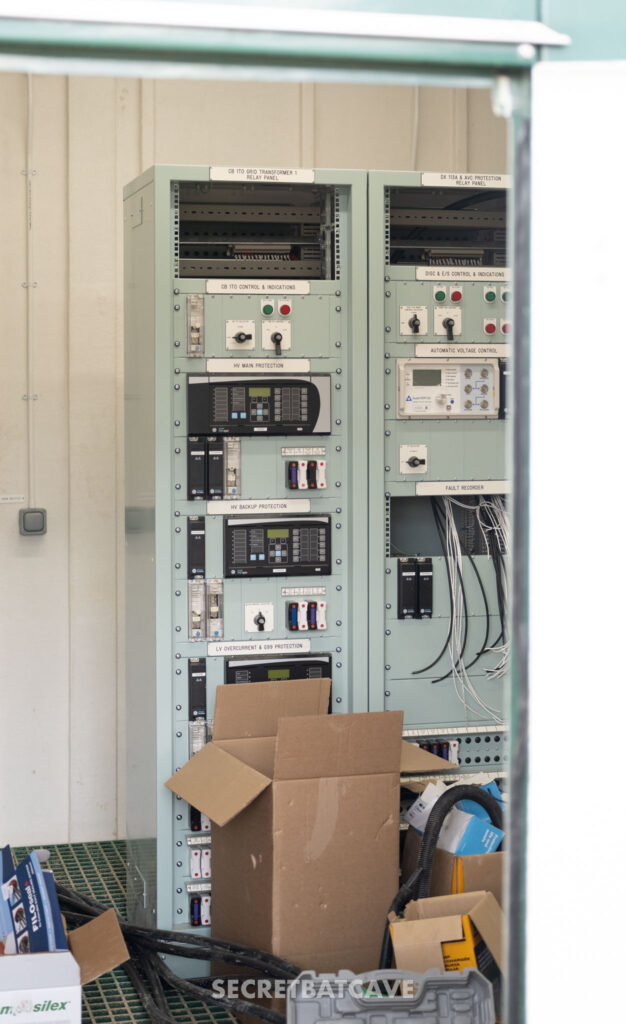 Here is a glimpse in the control room. I love the sexy labels on the panels. These are designed to be around for a long time. All of these devices are designed to monitor and control the transformer and cutoff systems.