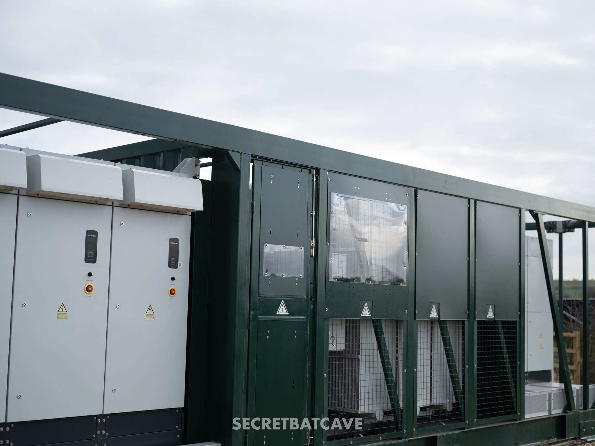 The cables come up from the inverters and are fed into overhead bus bars. They feed into the big white box that is the transformer. This thing is the size of a semi detached house.